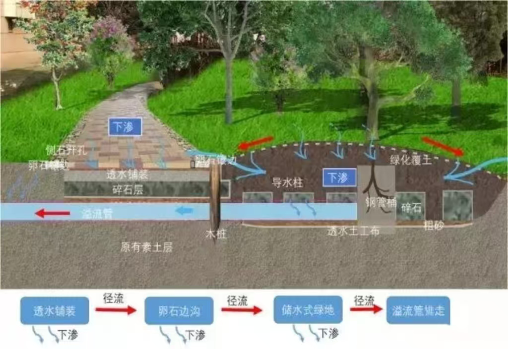 ·透水铺装:应用于人行道、停车场等区域,采用透水砖、透水混凝土等材料,使雨水迅速下渗,补充地下水,有效减少地表积水。