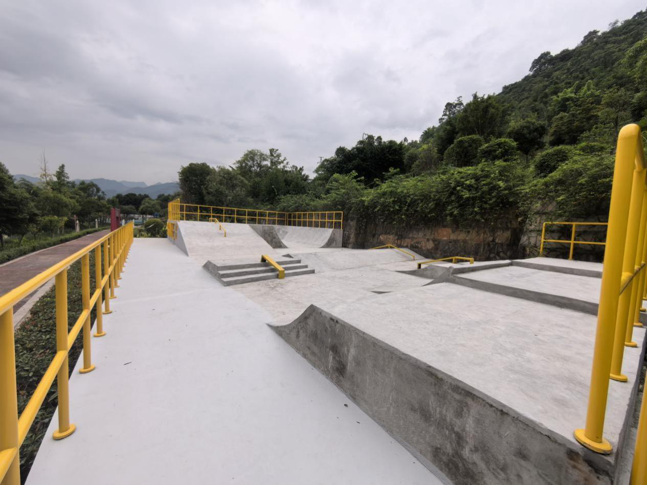250㎡轮滑健身区:是一处由混凝土地面、造型及护栏等构成的专业轮滑场地。爱好者们可身着护具飞驰,在这里,新手与达人都能找到专属乐趣。