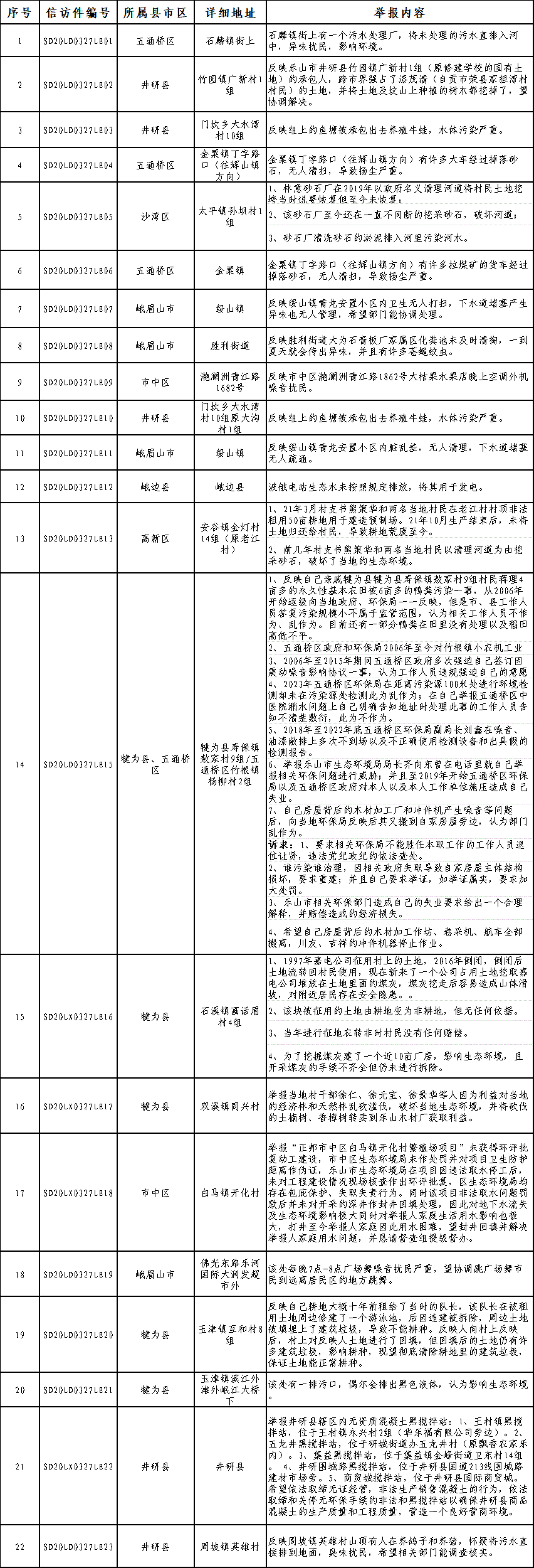 四川省生态环境保护督察群众来电来信举报受理情况公示表(第10批,2024年3月27日受理)