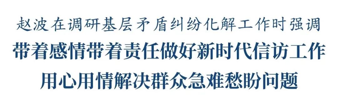 调研中,赵波指出,信访工作是密切党委政府与广大人民群众联系的桥梁和纽带,是送上门来的群众工作。各地各部门要牢固树立以人民为中心的发展思想,结合党建引领心连心“接诉即办”改革,进一步畅通和规范群众诉求表达、利益协调、权益保障通道,为人民群众解难事、办实事。要坚持和发展新时代“枫桥经验”,抓好信访矛盾源头治理、前端化解,举一反三、系统施策,及时将矛盾纠纷解决在基层、化解在萌芽状态。要结合开展深入贯彻中央八项规定精神学习教育,传承弘扬“四下基层”优良作风,严格落实领导干部接访下访和包案督办重点信访案件制度,实打实化解疑难复杂信访案件。要坚持和加强党对信访工作的全面领导,着力构建党委统一领导、政府组织实施、信访工作联席会议协调、信访部门推动、各方齐抓共管的信访工作格局,凝心聚力推动全市信访工作高质量发展。