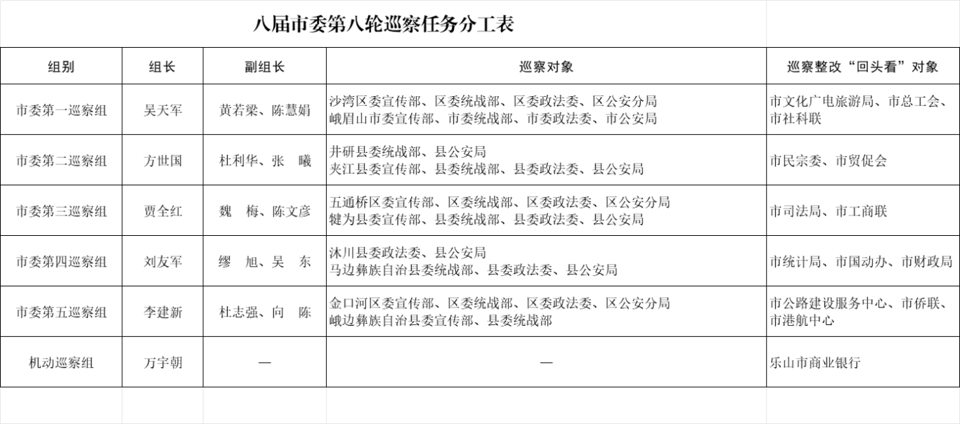 经市委批准,八届市委第八轮巡察将对五通桥区、沙湾区等10个县(市、区)的宣传、统战、政法和公安部门开展提级巡察,对市民族宗教委、市司法局等14个部门开展巡察整改“回头看”。