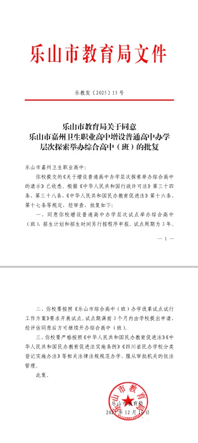 乐教发〔2025〕15号乐山市教育局关于同意乐山市嘉州卫生职业高中增设普通高中办学层次探索举办综合高中(班)的批复