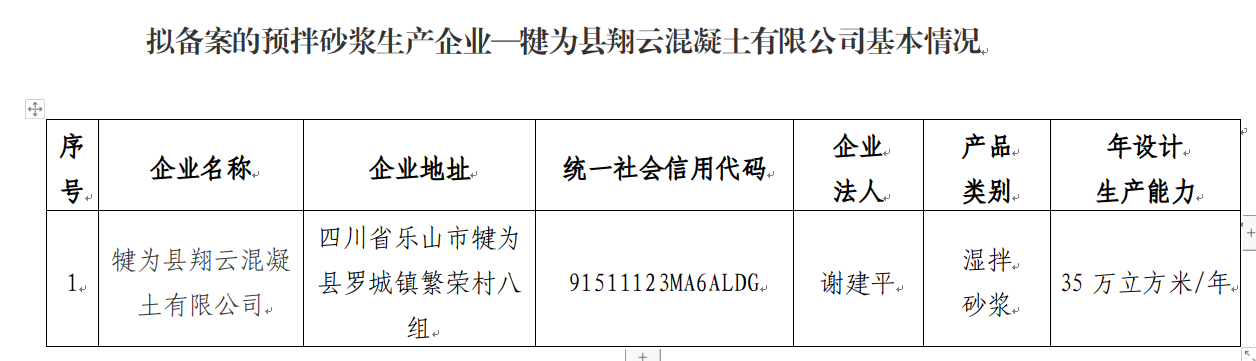 附件:拟备案的预拌砂浆生产企业—犍为县翔云混凝土有限公司基本情况