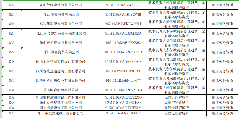 根据《建筑业企业资质管理规定》(住房城乡建设部第22号令)和《四川省住房和城乡建设厅关于进一步规范建筑企业资质申办有关事项的通知》(川建审发〔2023〕30号)等文件要求,我局于2025年9月16日在乐山市住房和城乡建设局官网向社会公布了《关于拟撤销部分建筑业企业资质的意见公示》(公示时间为2025年9月16日至2025年9月29日),公示期内部分企业提交书面申辩材料,我局进行复核。经研究,决定依法撤销乐山四泰铭建筑劳务有限公司等35家企业建筑业资质。