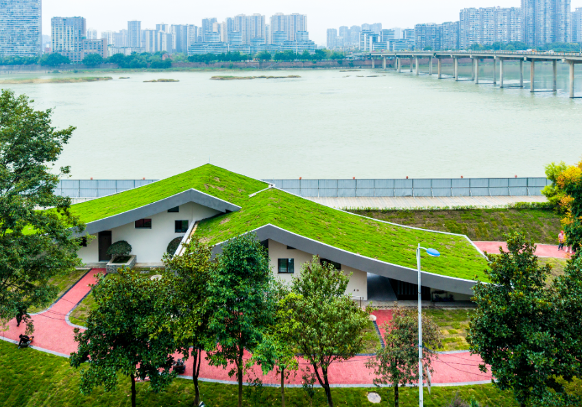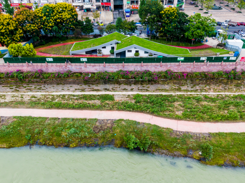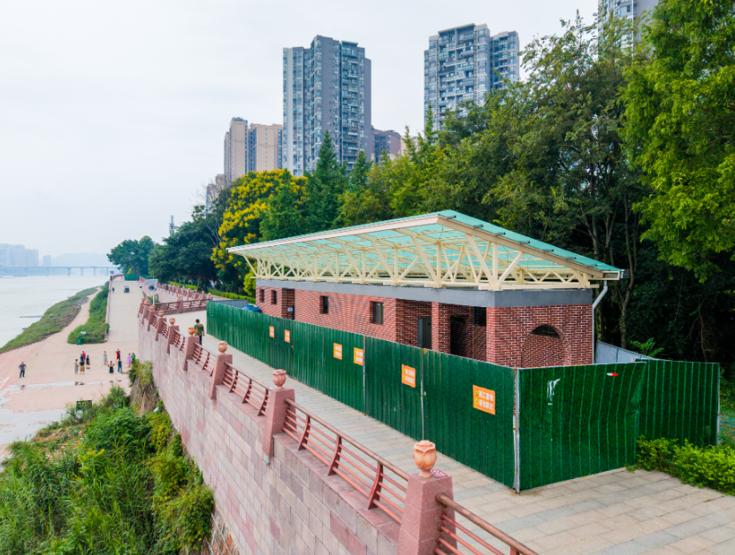 刚刚完工的1号公厕外观古朴,呈现出浓浓的新中式风。屋顶外观为双翅飞行造型,顶部采用绿色草坪覆盖的节能设计,起到冬暖夏凉的作用;公厕内部宽敞干净,共设置15个男女蹲位,并增设母婴室、第三卫生间、休闲座椅等设施,均采用无障碍设计。如厕后,市民可通过一条无障碍坡道直达河堤,一览沿江风光。此外,在公厕一侧,还专门设计了一面水景墙,在阳光的照耀下,清澈的池水映照在水景墙上显得十分灵动。