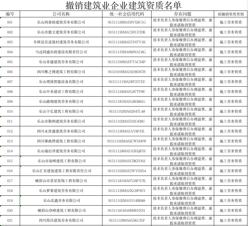 根据《建筑业企业资质管理规定》(住房城乡建设部第22号令)和《四川省住房和城乡建设厅关于进一步规范建筑企业资质申办有关事项的通知》(川建审发〔2023〕30号)等文件要求,我局于2025年9月16日在乐山市住房和城乡建设局官网向社会公布了《关于拟撤销部分建筑业企业资质的意见公示》(公示时间为2025年9月16日至2025年9月29日),公示期内部分企业提交书面申辩材料,我局进行复核。经研究,决定依法撤销乐山四泰铭建筑劳务有限公司等35家企业建筑业资质。
