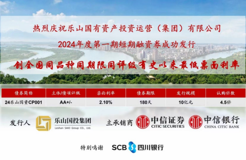 2024年6月13日,乐山国投集团成功发行2024年度第一期短期融资券(CP),发行规模10亿元,票面年利率2.1%,期限180天,本期短期融资券发行创全国同品种、同期限、同评级最低票面利率。