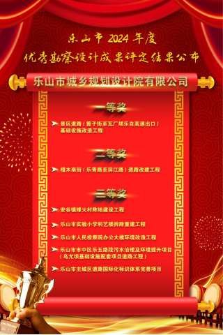 近日,由乐山市勘察设计协会组织开展的2024年度乐山市优秀工程勘察设计成果评选工作落下帷幕,乐山城投集团下属乐山市城乡规划设计院有限公司(以下简称:规划院公司)申报的景区道路(篦子街至瓦厂坝乐自高速出口)基础设施改造工程、檀木南街(乐青路至滨江路)道路改建工程、安谷镇烽火村阵地建设工程、乐山市实验小学科艺楼拆除重建工程、乐山市人民检察院办公大楼环境改造工程等7个项目荣获优秀工程勘察设计奖,其中,一等奖、二等奖各1项,三等奖5项。