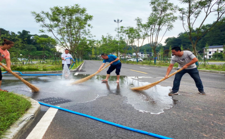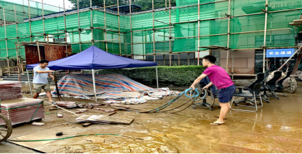 (工作人员清淤、冲洗,尽快恢复项目现场秩序)