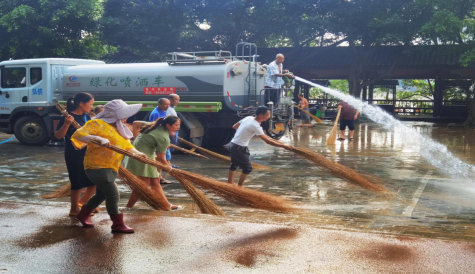 (工作人员抓紧清扫八仙洞停车场淤泥、整理受损物品)