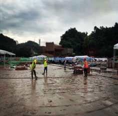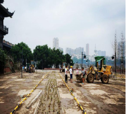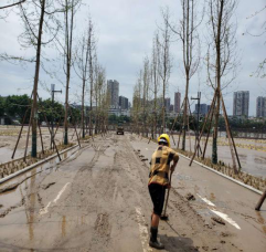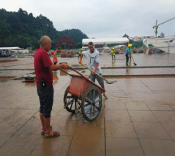 在“景点变景区”项目现场,18日被洪水全部淹没的施工场地已裸露地面,厚厚的泥浆从码头边缘一直覆盖到凌云路旁,广场上的原材料、施工器具等被洪水冲走大部分,留下的便是一片散乱。为了能尽快恢复施工建设,8月19日当天,集团公司协同工程总承包公司迅速调集挖掘机、抽水泵、清扫车及货车等,并组织大量工作人员开展灾后恢复工作,大家分工协作,有序推进,一边清扫冲洗,一边清理剩下的建筑材料,在垃圾车一趟又一趟的奔波后,现场已大部分恢复秩序。