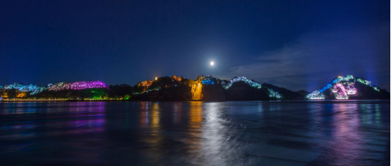 站在船头,江风徐徐,梵音袅袅,沿线的“心中有佛、禅意城市、国画山水、睡佛初醒、五色佛光”等璀璨夜色尽收眼底;待游船行至乐山大佛佛脚处,“心中有佛”的声光演绎让人沉浸其中,运用高科技声光电手段,通过VR视频,在乐山大佛佛脚台的峭壁处,可“真实”听见讲述大佛建造史、见证大佛的前世今生,领略夜观大佛的震撼与神奇;航行途中,凌云九峰、嘉定坊、巨型睡佛、嘉州古城……三江六岸灯光连连,佛、城、山、水交相辉映,勾画出一幅丹青山水画卷。