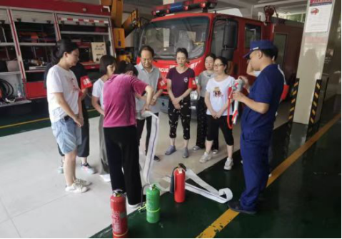 百禄路消防救援站指战员为大家现场展示和讲解了基础消防器材的正确使用、水带连接操作与使用、防毒面罩佩戴、遇有火灾事故时的正确处置流程等消防技能知识。
