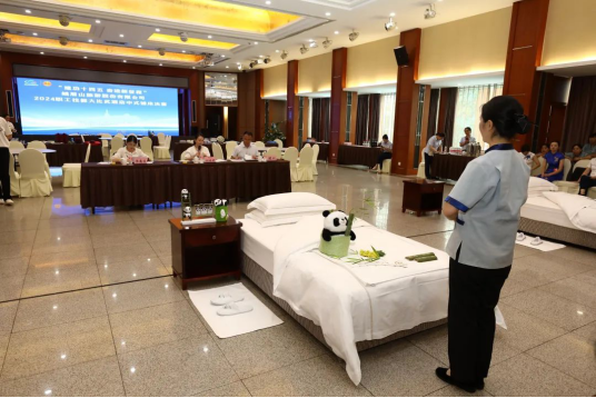 来自红珠山宾馆、峨眉山大酒店、成都峨眉雪芽大酒店、金顶大酒店、雅林茶轩分公司的16名选手角逐酒店中式铺床、中餐宴会摆台两个赛项。比赛主要从选手仪态仪表、铺床技艺、中餐摆台专业技能方面开展比拼,主要考察选手的熟练性、规范性及个性化服务应用与职业素养,专家裁判组本着“公平、公正、公开、科学、规范”的原则,严格按照评分标准对选手进行综合评价,若干评分项目精确到厘米,高标准、严要求,真正赛出专业水平。