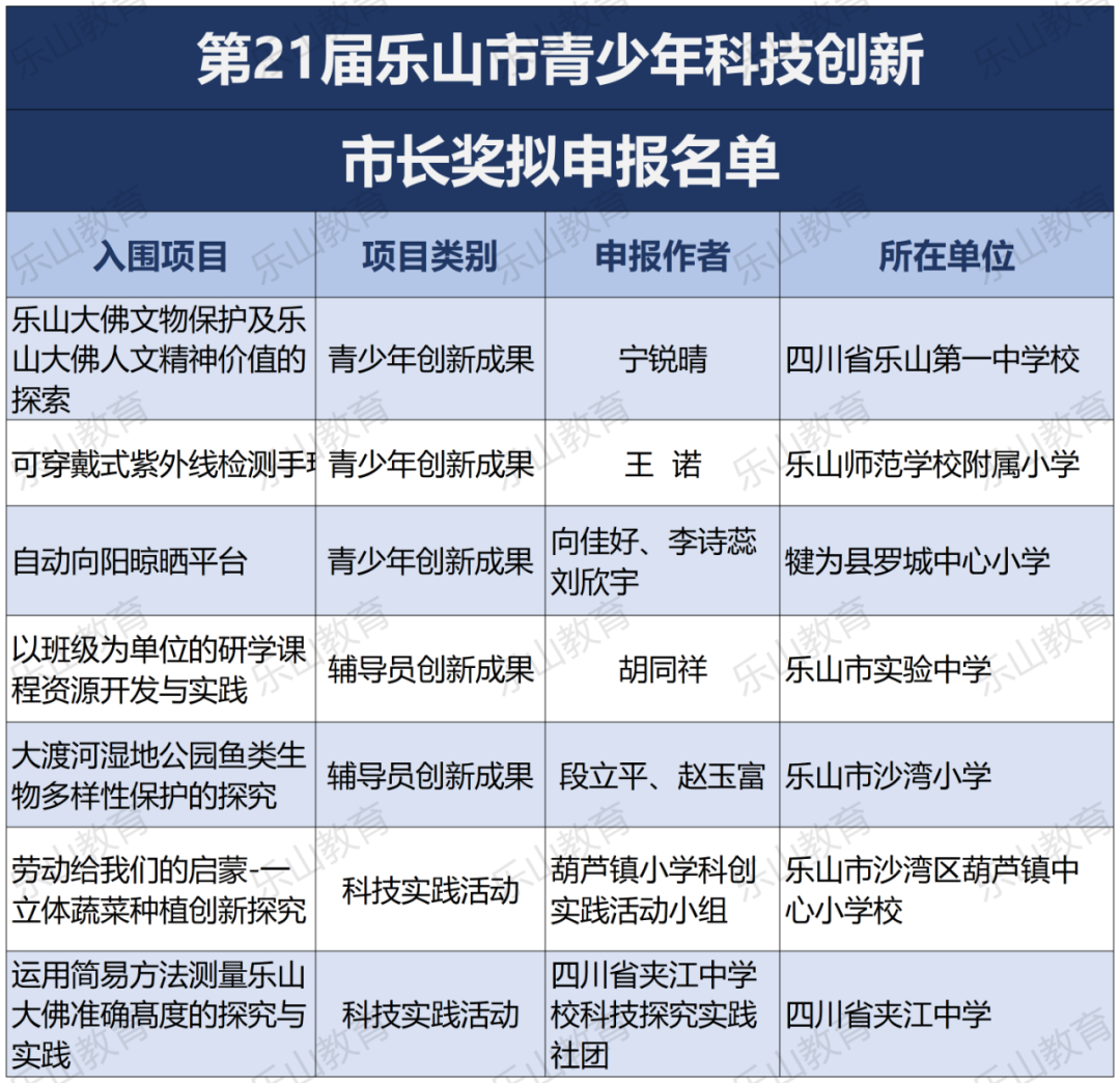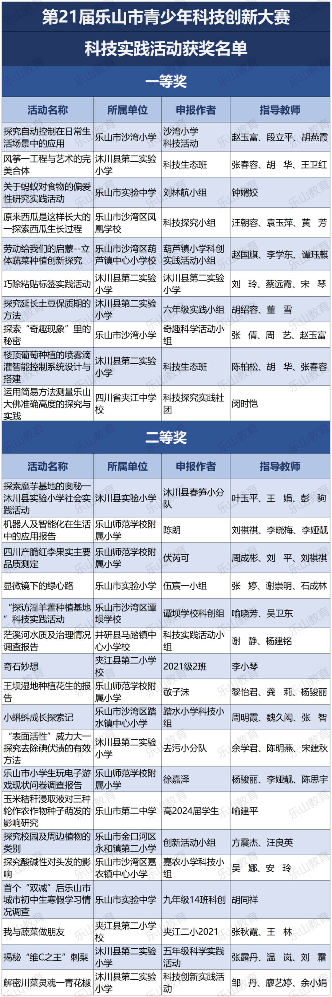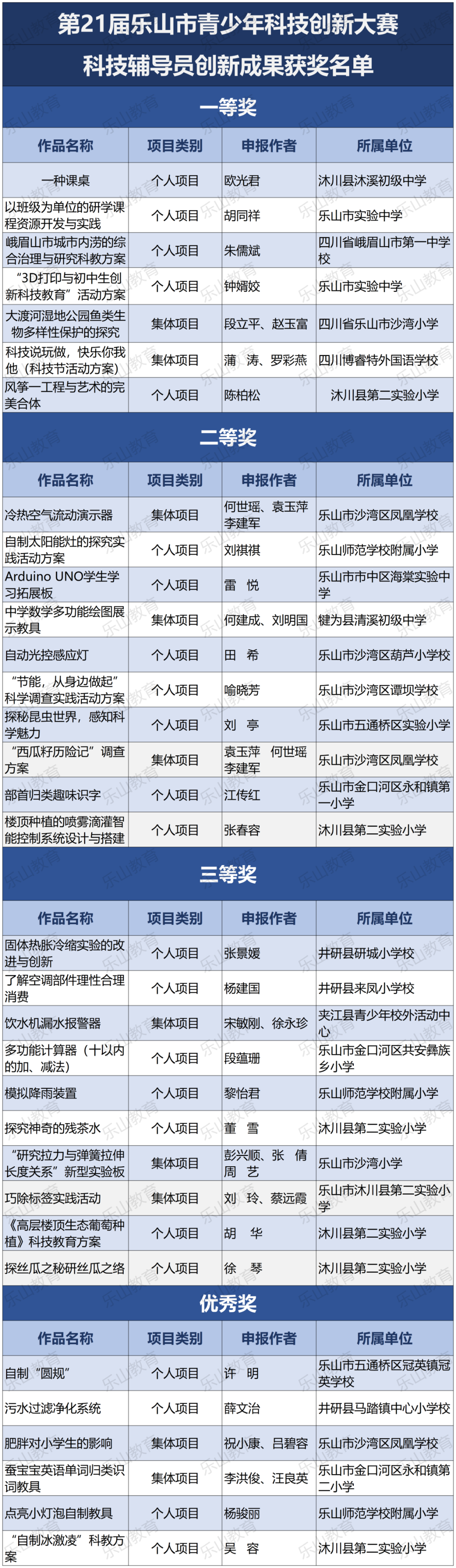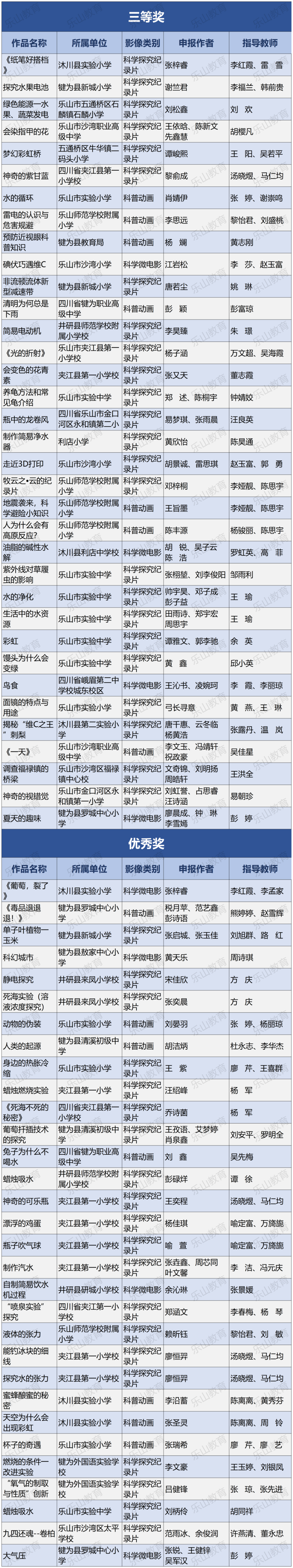经过市科协、市教育局研究决定,将21届乐山市科技创新大赛辅导学生获得一等奖中的30名指导教师评为“优秀辅导员”;对在21届乐山市青少年科技创新大赛组织工作中做出突出贡献的10个单位授予“优秀组织单位”奖项。