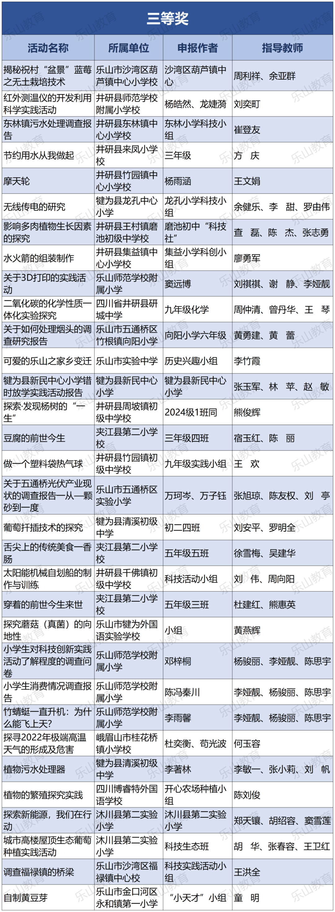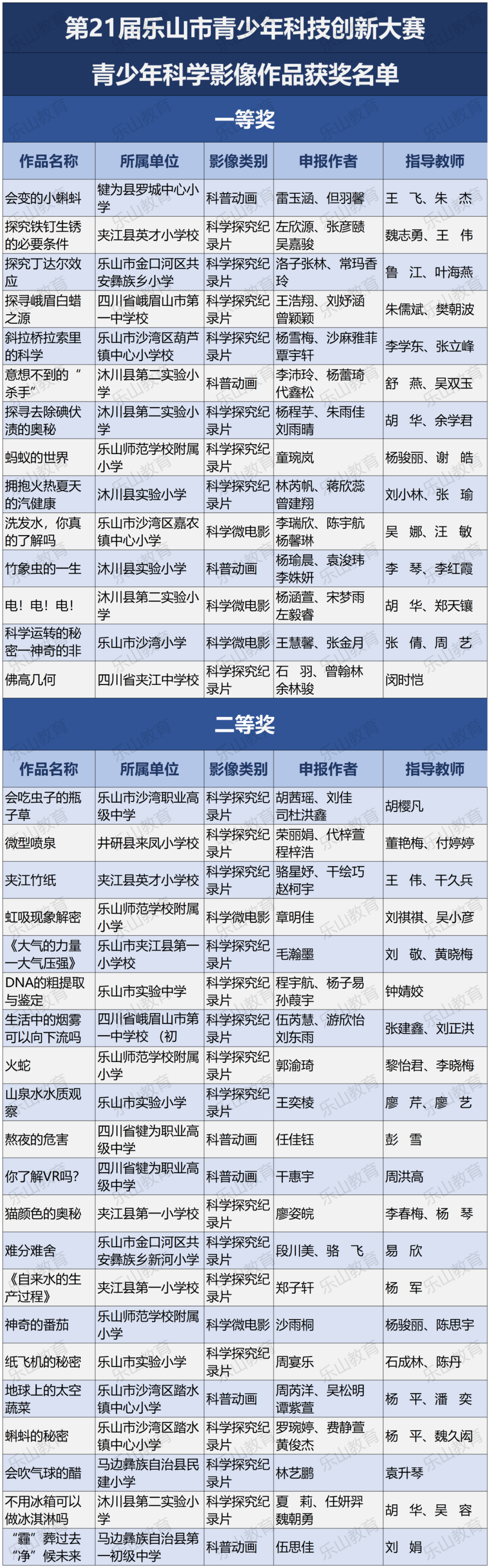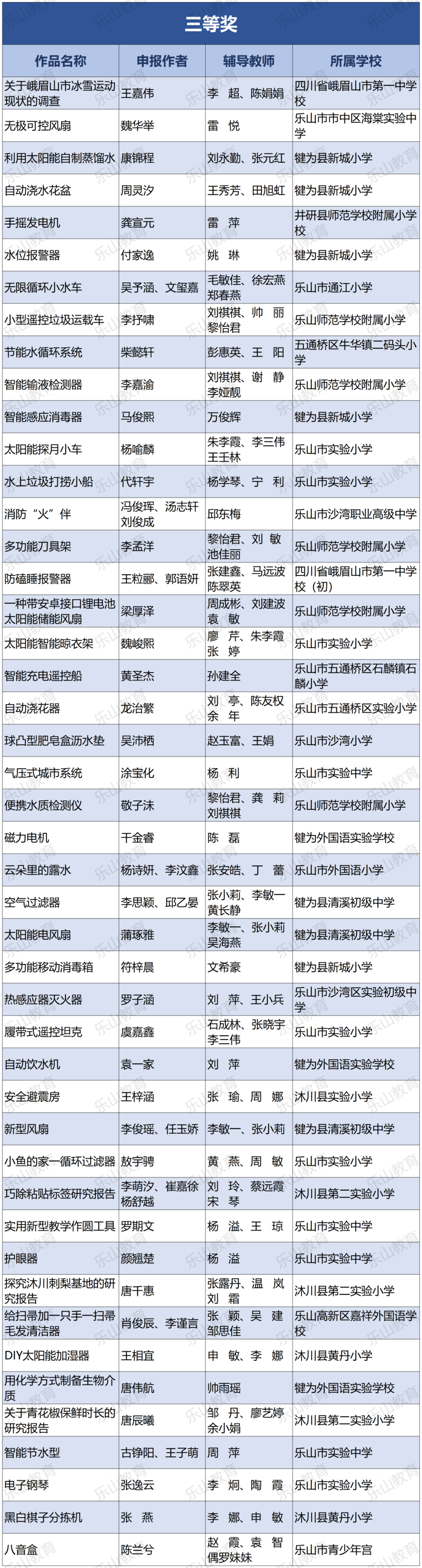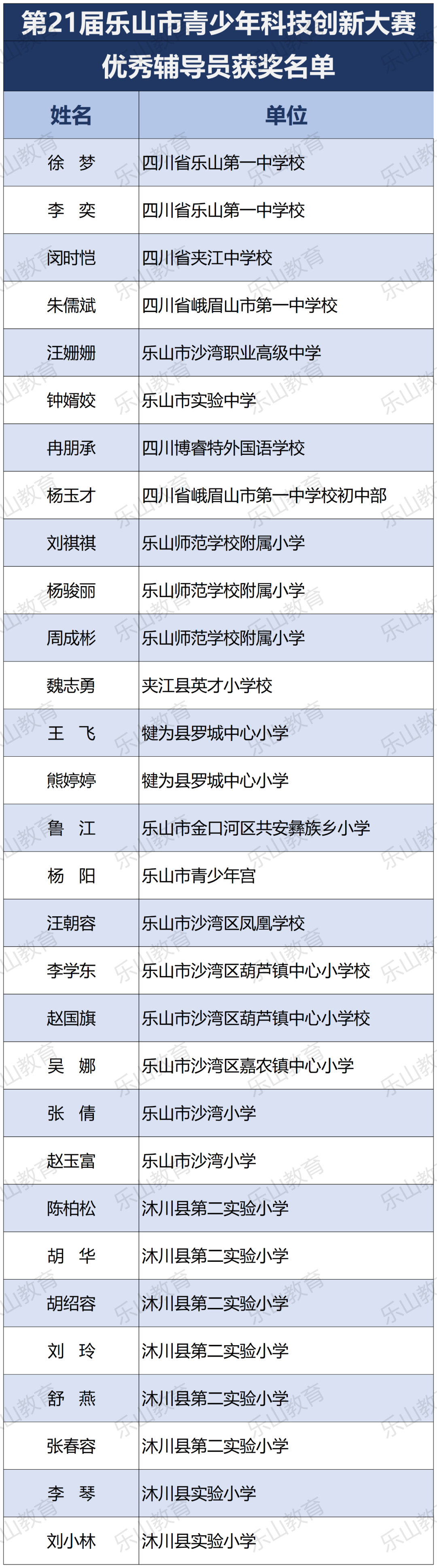 经过市科协、市教育局研究决定,将21届乐山市科技创新大赛辅导学生获得一等奖中的30名指导教师评为“优秀辅导员”;对在21届乐山市青少年科技创新大赛组织工作中做出突出贡献的10个单位授予“优秀组织单位”奖项。