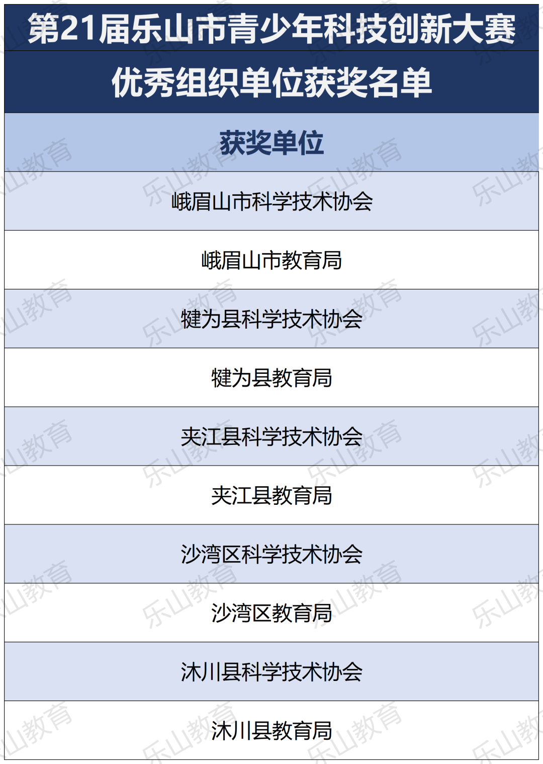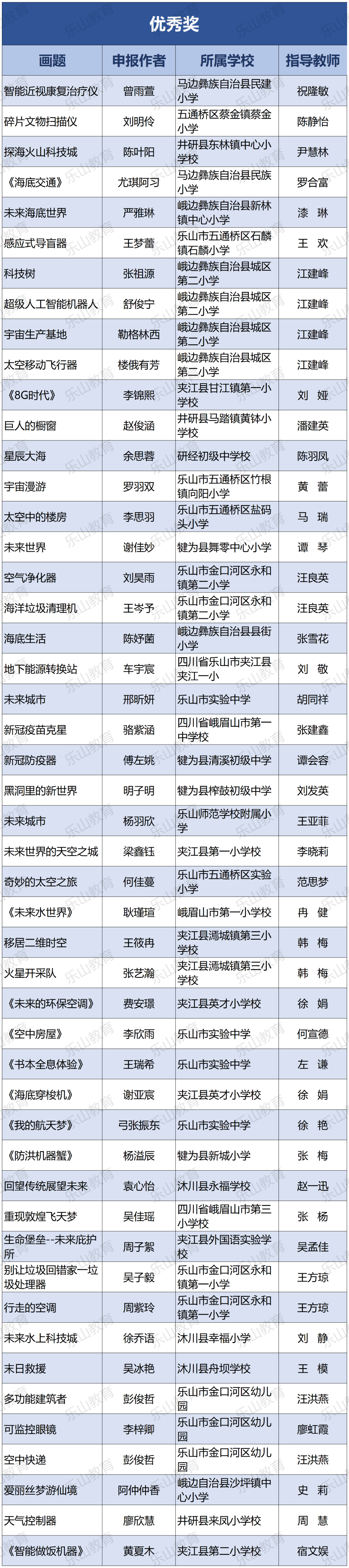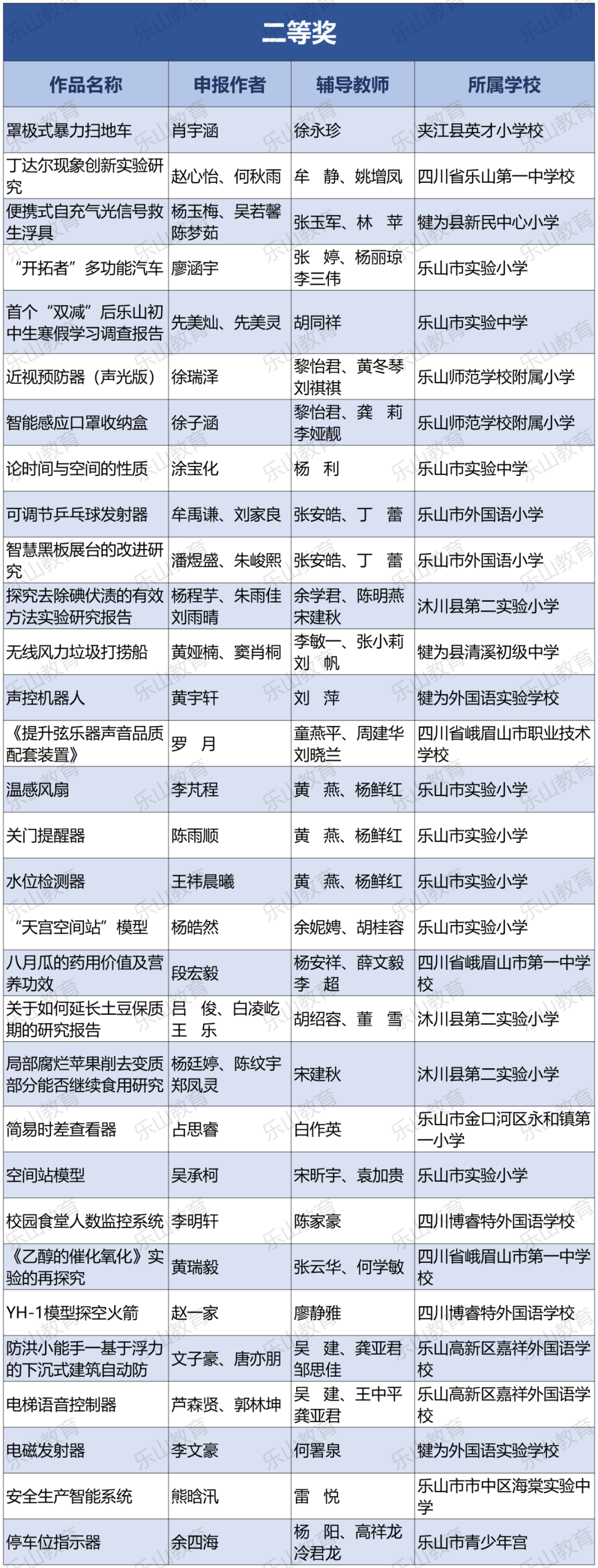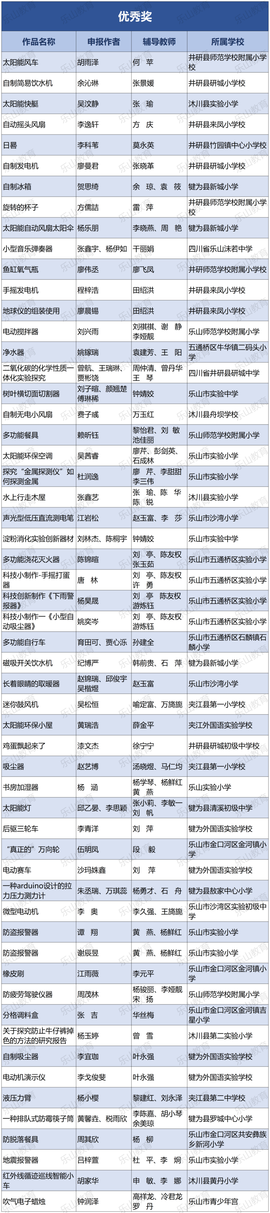 经过市科协、市教育局研究决定,将21届乐山市科技创新大赛辅导学生获得一等奖中的30名指导教师评为“优秀辅导员”;对在21届乐山市青少年科技创新大赛组织工作中做出突出贡献的10个单位授予“优秀组织单位”奖项。
