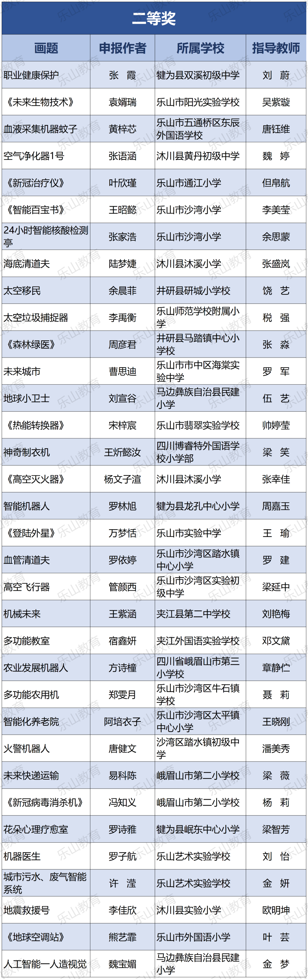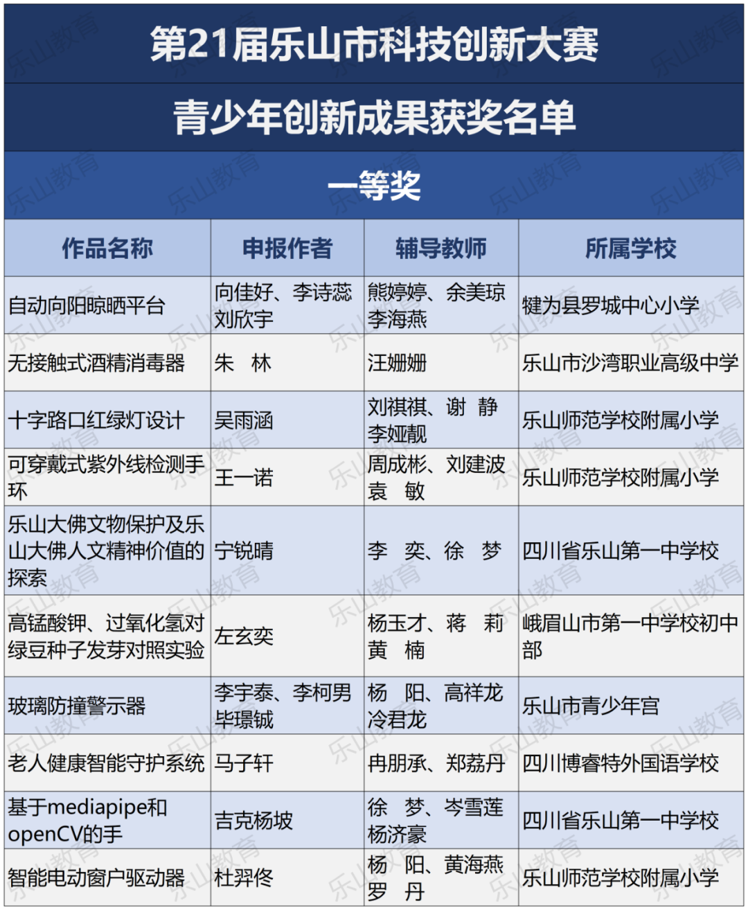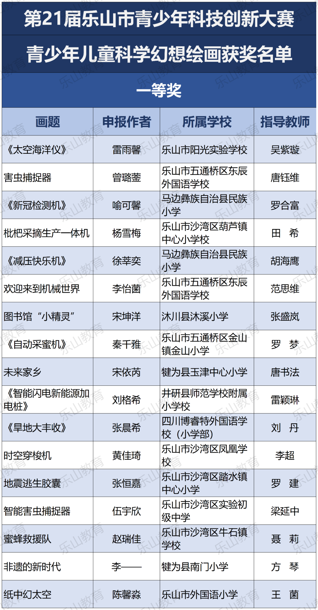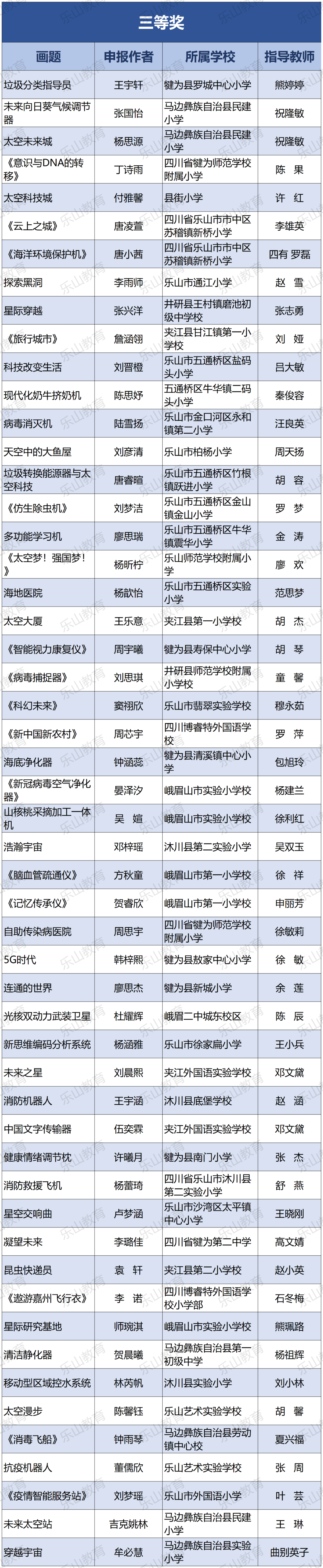 经过市科协、市教育局研究决定,将21届乐山市科技创新大赛辅导学生获得一等奖中的30名指导教师评为“优秀辅导员”;对在21届乐山市青少年科技创新大赛组织工作中做出突出贡献的10个单位授予“优秀组织单位”奖项。