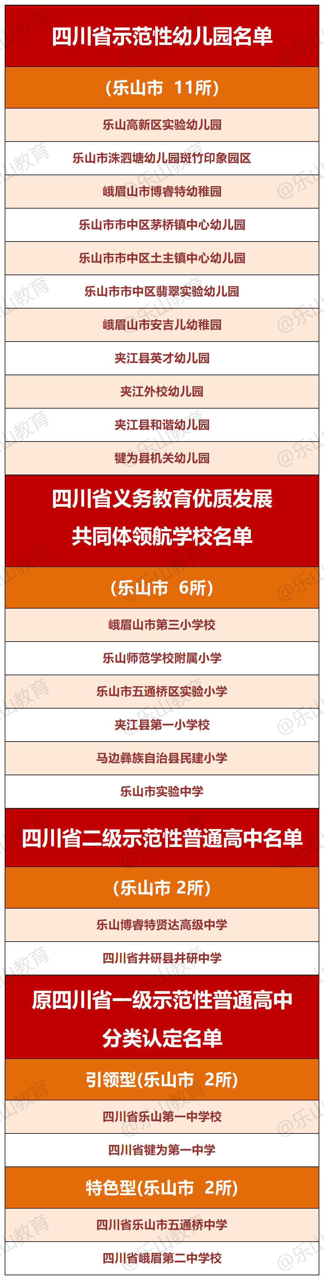 乐山市共有23所学校上榜,其中,四川省示范性幼儿园11所,四川省义务教育优质发展共同体领航学校6所,四川省二级示范性普通高中2所,原四川省一级示范性普通高中认定引领型2所、特色型2所。