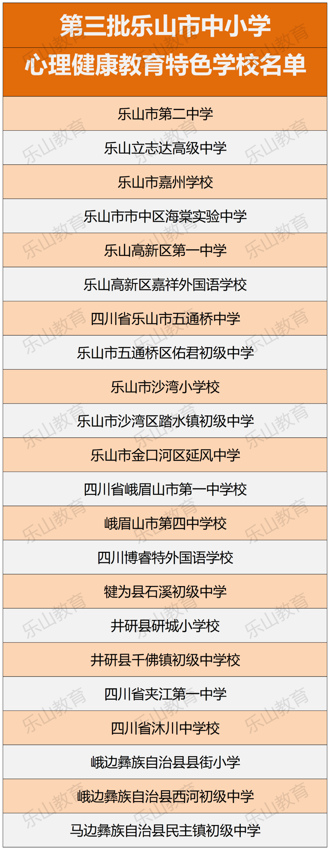 根据《乐山市教育局关于做好2022年乐山市中小学心理健康教育特色学校创建工作的通知》要求,在学校申报、县(市、区)初评的基础上,经市教育局组织专家评估验收,确定命名乐山市第二中学等22所学校为第三批乐山市中小学心理健康教育特色学校。