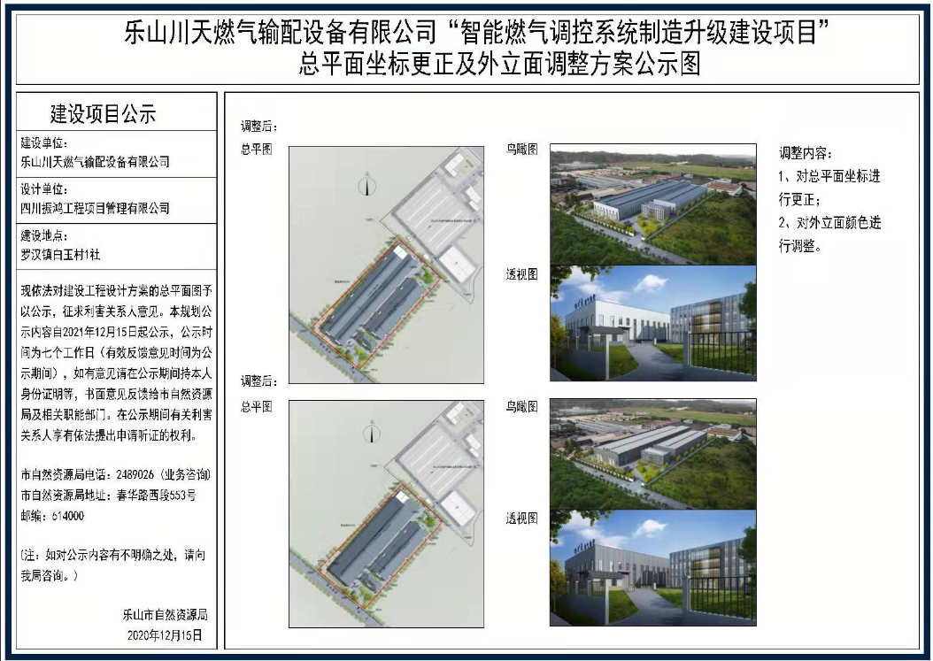 乐山川天燃气输配设备有限公司“智能燃气调控系统制造升级建设项目”总平面坐标更正及外立面调整方案公示