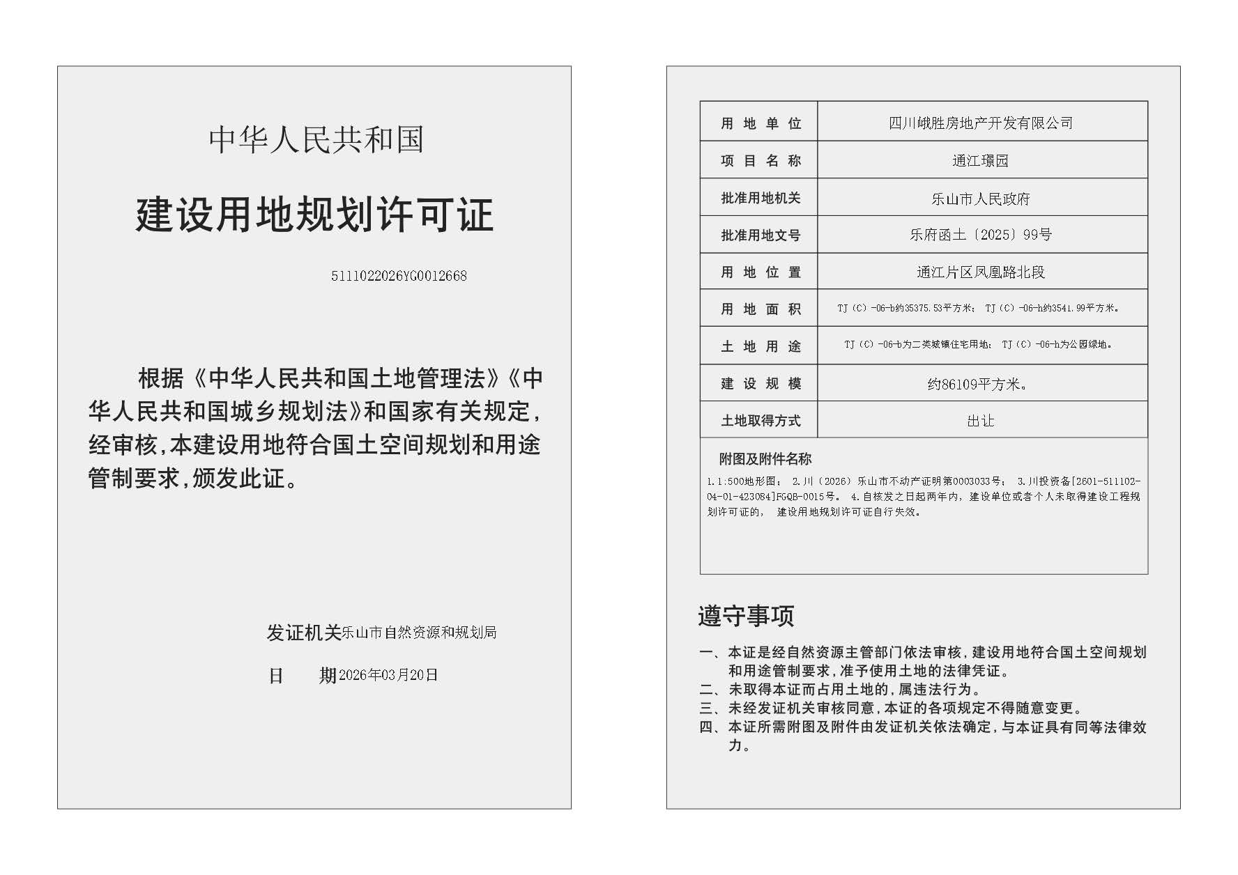 四川峨胜房地产开发有限公司通江璟园项目建设用地规划许可证公布