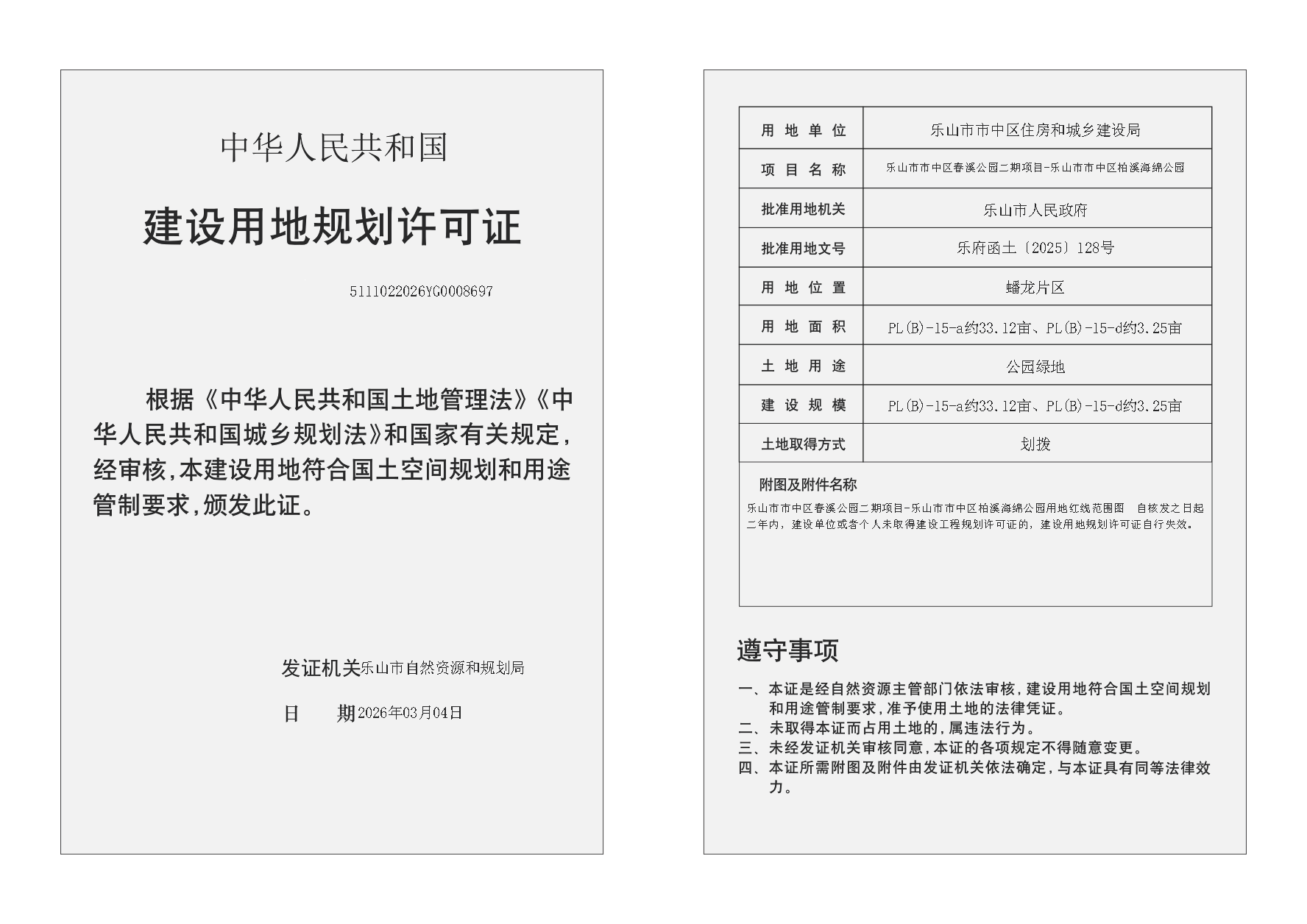 乐山市市中区春溪公园二期项目-乐山市市中区柏溪海绵公园建设用地规划许可证公布