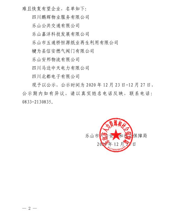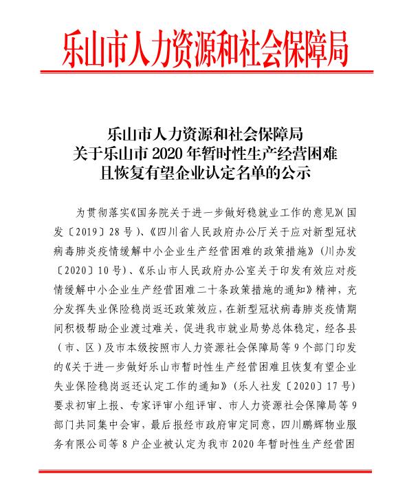 关于乐山市2020年暂时性生产经营困难 且恢复有望企业认定名单的公示
