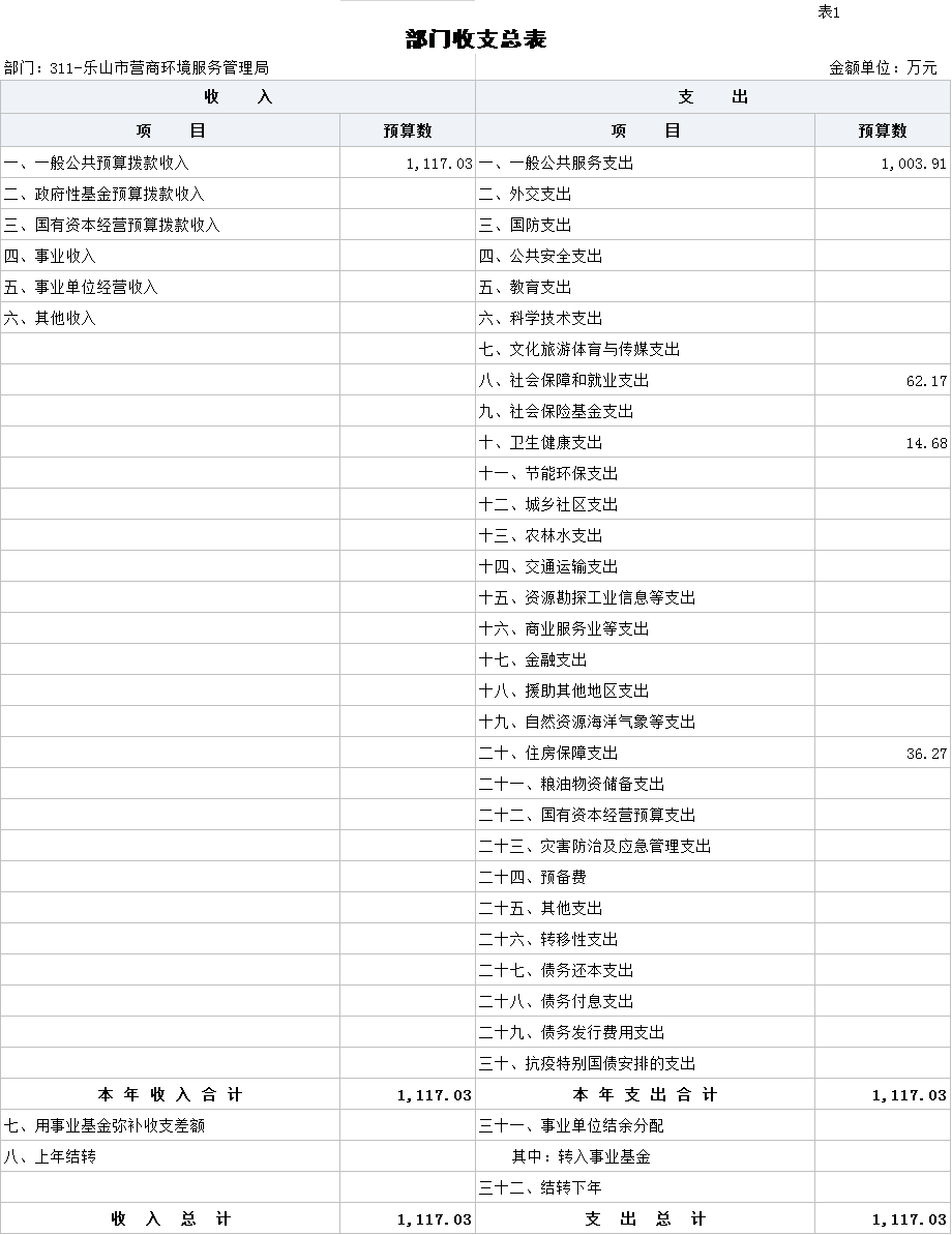 收入包括:本年一般公共预算拨款收入1117.03万元、本年政府性基金预算拨款收入0万元;支出包括:一般公共服务支出1003.91万元、社会保障支出62.17万元、卫生健康支出14.68万元、住房保障支出36.27万元。
