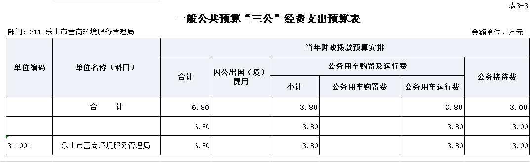 乐山市营商环境服务管理局2022年“三公”经费财政拨款预算数6.8万元,其中:公务接待费3万元,公务用车购置及运行维护费3.8万元。受新冠肺炎疫情影响,2022年市级年初部门预算暂不编列因公出国(境)经费。执行中,市级部门确需执行出国(境)任务和计划的,按照“一事一议”的方式按程序报批后安排经费。