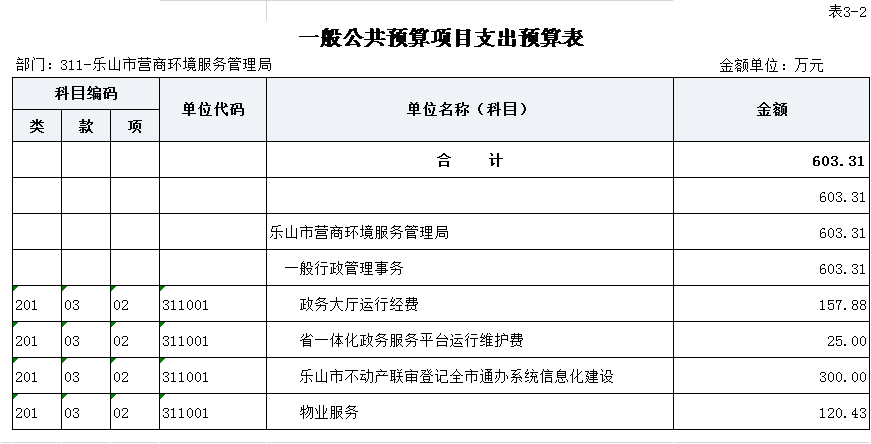 311001-乐山市营商环境服务管理局 | 政务大厅运行经费 | 157.88 | 保障市本级政务服务实体大厅的有序运行。 | 产出指标 | 成本指标 | 网络通讯费 | = | 14.88 | 万元 | 0 | 正向指标 |
