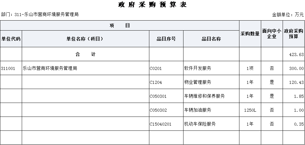 2022年,乐山市营商环境服务管理局安排政府采购预算423.63万元,其中,政府采购货物预算0万元;政府采购工程预算0万元;政府采购服务预算423.63万元。
