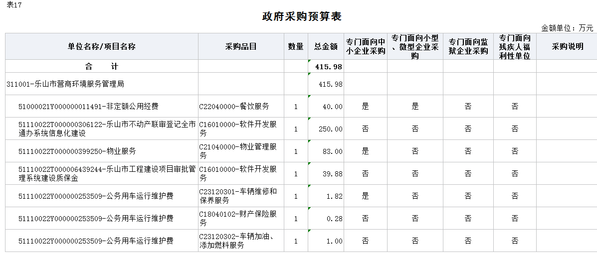2023年,乐山市营商环境服务管理局安排政府采购预算415.98万元,其中,政府采购货物预算0万元;政府采购工程预算0万元;政府采购服务预算415.98万元。