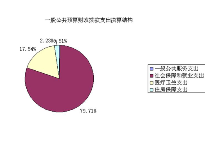 2017年一般公共预算财政拨款支出9709.12万元,主要用于以下方面:一般公共服务支出50万元,占0.51%;社会保障和就业支出7739.29万元,占79.71%;医疗卫生支出1703.23万元,占17.54%;住房保障支出216.59万元,占2.23%。