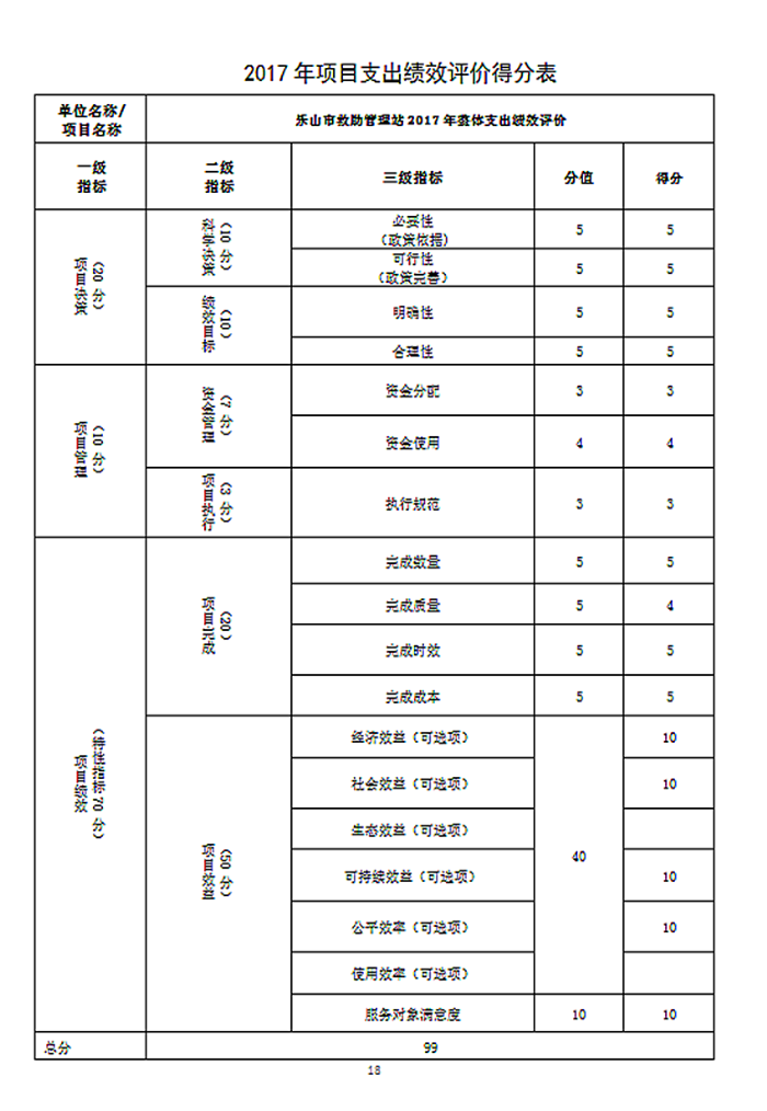本部门对下属单位乐山市救助管理站开展了整体支出绩效评价,得分为99分,存在的问题:一是救助资金管理和救助工作流程还需要进一步规范;二是救助工作内容还需要进一步拓展完善。下一步改进措施:一是建章立制,进一步规范救助资金管理和救助工作流程;二是拓展救助内容,救助工作重点除对救助者的衣食住行医等基本保障外,应在加强对救助者心理咨询、技能培训、教育矫治等方面开展工作,拓展服务范围,提升我市救助服务工作水平。三是本级财政逐年加大对流浪乞讨人员救助资金的投入力度。
