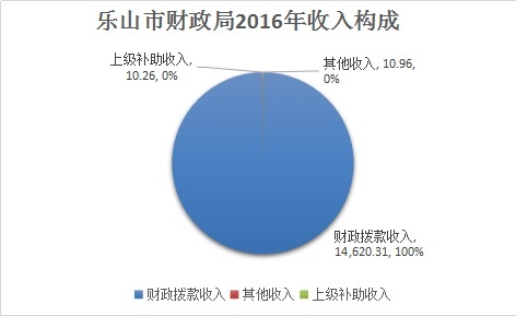 2016年乐山市财政局本年收入合计14641.52万元,其中:财政拨款收入14620.31万元,占99.86%;上级补助收入10.26万元,占0.07%;事业收入0万元,占0%;经营收入0万元,占0%;附属单位上缴收入0万元,占0%;其他收入10.96万元,占0.07%。