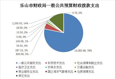 乐山市财政局2016年一般公共预算财政拨款支出16726.33万元,主要用于以下方面:一般公共服务支出13083.98万元,占78.22%;科学技术支出850万元,占5.08%;社会保障和就业支出287.15万元,占1.72%;医疗卫生支出55.91万元,占0.33%;农林水支出143.06万元,占0.86%;;交通运输支出5万元,占0.03%;商业服务业支出13.5万元,占0.08%;国土海洋气象等支出18万元,占0.11%;住房保障支出2265.03万元,占13.54%;其他支出4.7万元,占0.03%。