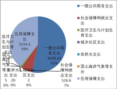 乐山市财政局2017年一般公共预算财政拨款支出8094.13万元,主要用于以下方面:一般公共服务支出4330.43万元,占53.50%;社会保障和就业支出526.60万元,占6.51%;医疗卫生与计划生育支出55.89万元,占0.69%;城乡社区支出2万元,占0.02%;农林水支出20万元,占0.25%;国土海洋气象等支出5万元,占0.06%;住房保障支出3154.20万元,占38.97%。