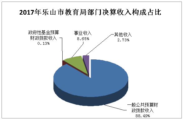 2017年乐山市教育局本年收入合计53640.5万元,其中:一般公共预算财政拨款收入47466.48万元,占88.49%;政府性基金预算财政拨款收入71.35万元,占0.13%;事业收入4639.03万元,占8.65%;其他收入1463.64万元,占2.73%。
