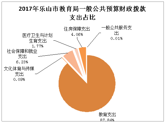 2017年一般公共预算财政拨款支出35912.87万元,主要用于以下方面:一般公共服务支出3.46万元,占0.01%;教育支出29456.48万元,占87.84%;文化体育与传媒支出28.76万元,占0.09%;社会保障和就业支出4365.39万元,占6.23%;医疗卫生支出601.31万元,占1.77%;住房保障支出1457.47万元,占4.06%。