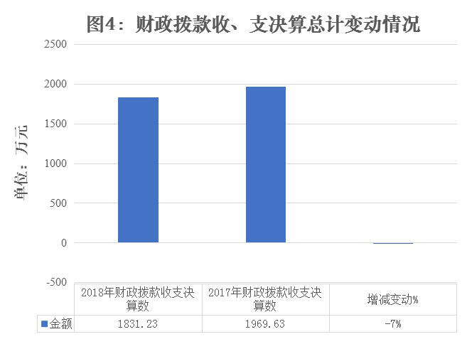 2018年财政拨款收、支总计1831.23万元。与2017年相比,财政拨款收、支总计各减少138.4万元,下降7%。主要变动原因是2017年跨年支付上年全市国有企业审计费用。