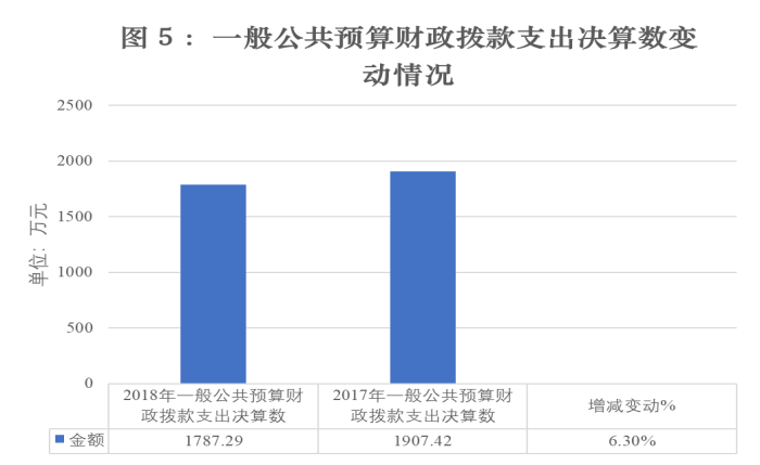 2018年一般公共预算财政拨款支出1787.29万元,占本年支出合计的96%。与2017年相比,一般公共预算财政拨款减少120.13万元,下降6.3%。主要变动原因是公车改革和厉行节约,压缩开支。