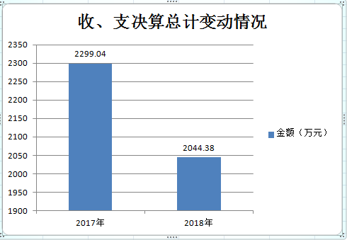 2018年度收、支总计2044.38万元。与2017年相比,收、支总计减少254.66万元,下降11%。主要变动原因是基本支出减少(人员变动造成工资、保险、抚恤金等变动)。