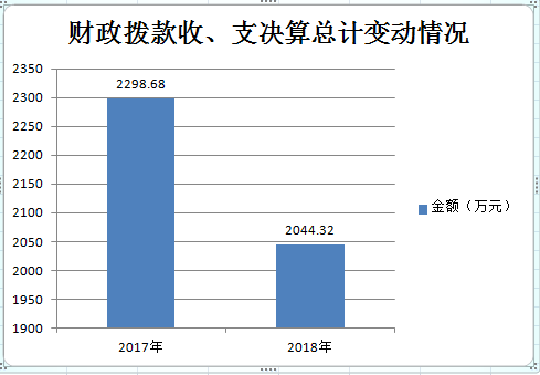 2018年财政拨款收、支总计2044.32万元。与2017年相比,财政拨款收、支总计减少254.36万元,下降11%。主要变动原因是基本支出减少(人员变动造成工资、保险、抚恤金等变动)。
