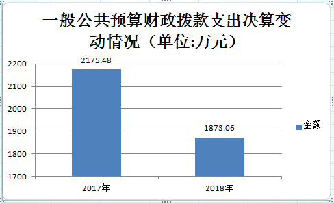 2018年一般公共预算财政拨款支出1873.06万元,占本年支出合计的100%。与2017年相比,一般公共预算财政拨款减少302.42万元,下降14%。主要变动原因是基本支出减少(人员变动造成工资、保险、抚恤金等变动)。