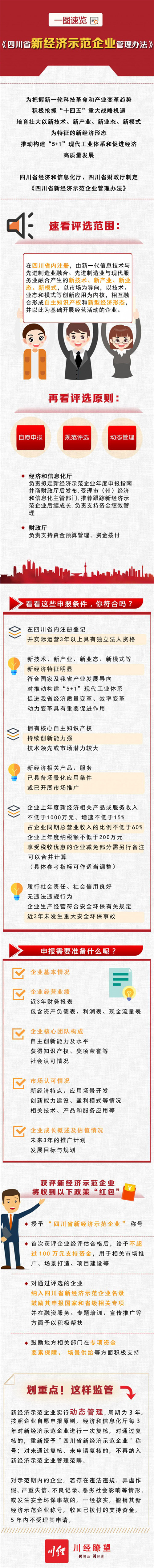 为把握新一轮科技革命和产业变革趋势,积极抢抓“十四五”重大战略机遇,培育壮大以新技术、新产业、新业态、新模式为特征的新经济形态,推动构建“5+1”现代工业体系和促进经济高质量发展,四川省经济和信息化厅、四川省财政厅制定了《四川省新经济示范企业管理办法》(以下简称《办法》),该《办法》有哪些亮点?一图速览带你看。