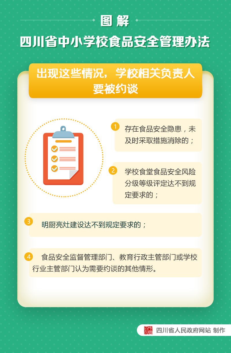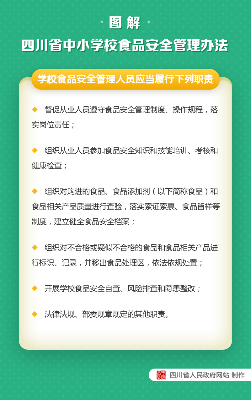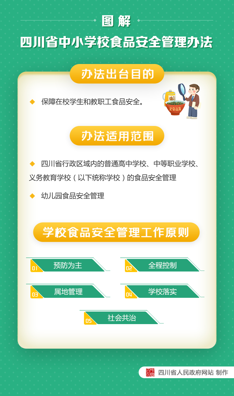 适用于四川省行政区域内的普通高中学校、中等职业学校、义务教育学校,幼儿园的《四川省中小学校食品安全管理办法》(以下简称《办法》)正式出台,自2020年3月1日起施行。