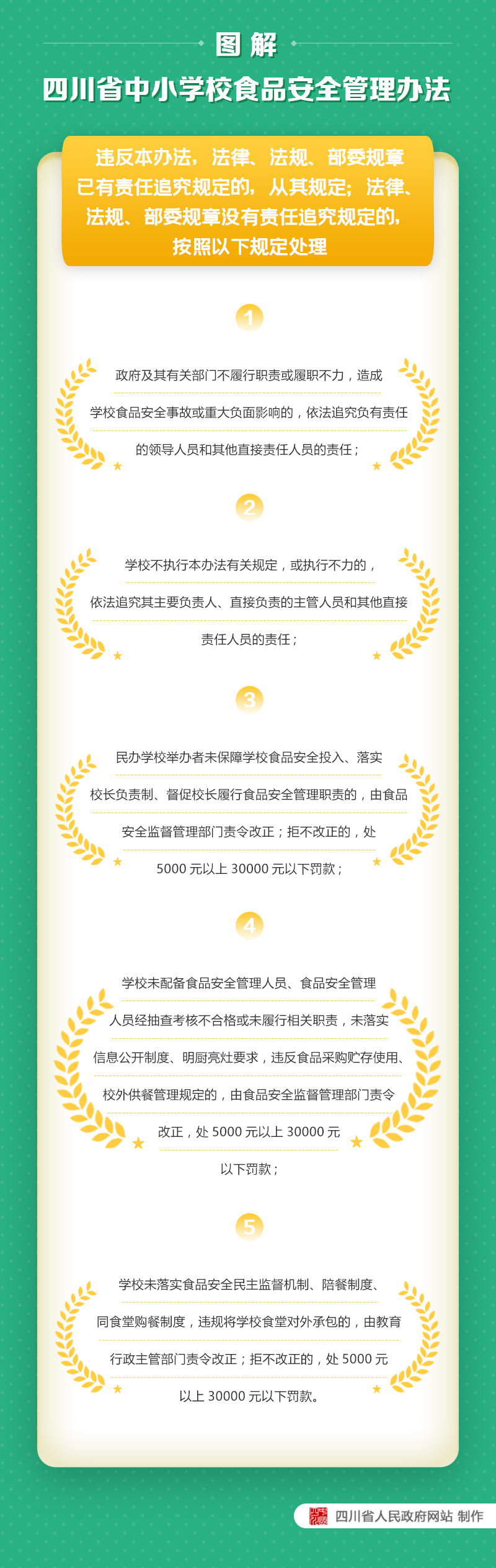 《办法》规定,学校履行食品安全主体责任,实行校长负责制,校长是食品安全第一责任人;学校校门外50米范围内不得确定为食品摊贩经营活动区域;学校未落实食品安全民主监督机制、陪餐制度、同食堂购餐制度,违规将学校食堂对外承包的,将可能面临5000元以上30000元以下罚款;针对供餐人数较少,难以建立食堂的学校,简单加工学生自带粮食、蔬菜或者为学生热饭为主的小规模农村学校,《办法》提出参照《四川省食品小作坊、小经营店及摊贩管理条例》进行管理。