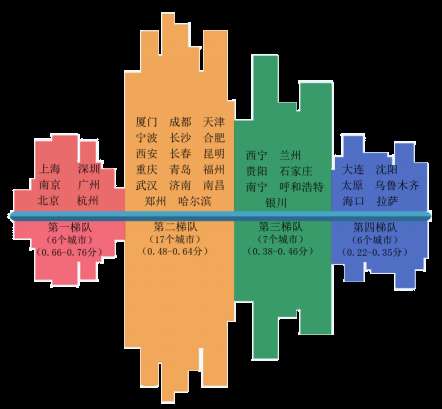 一方面,36个城市综合得分和各项一级指标得分均形成鲜明的4个梯队结构,不同梯队之间存在较为明显的分数差异(图2)。其中,对比2019年度试评估结果,第一和第四梯队城市稳定性较高;