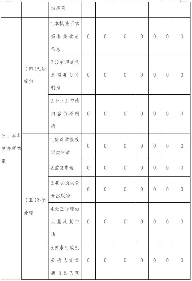 | 三、本年度办理结果 | (四)无法提供 | 1.本机关不掌握相关政府信息 | 0 | 0 | 0 | 0 | 0 | 0 | 0 |